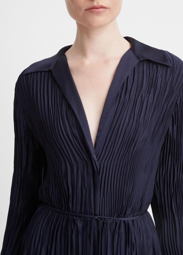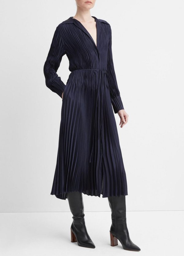 The classic shirt dress gains new dimension with pintuck-pleated satin that blooms open at the skirt for easy movement. The adjustable self-tie waist allows for a customized fit.
