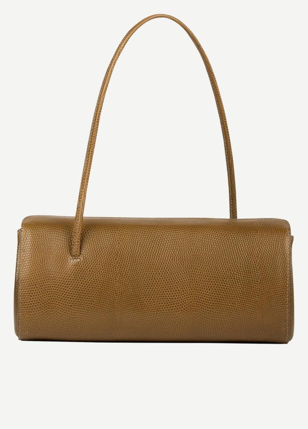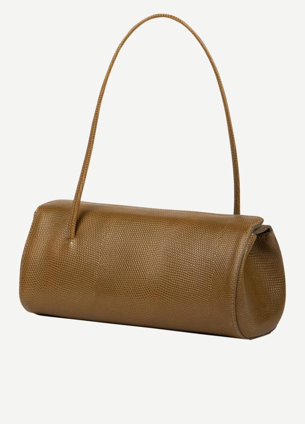 With an eye for playful minimalism, Little Liffner crafts modern handbags with timeless relevance in supple Italian leather. This strict and supple cylinder leather bag extends from a slim strap, designed to be worn over the shoulder or on the arm. A slim glinting chain gilds the lily.