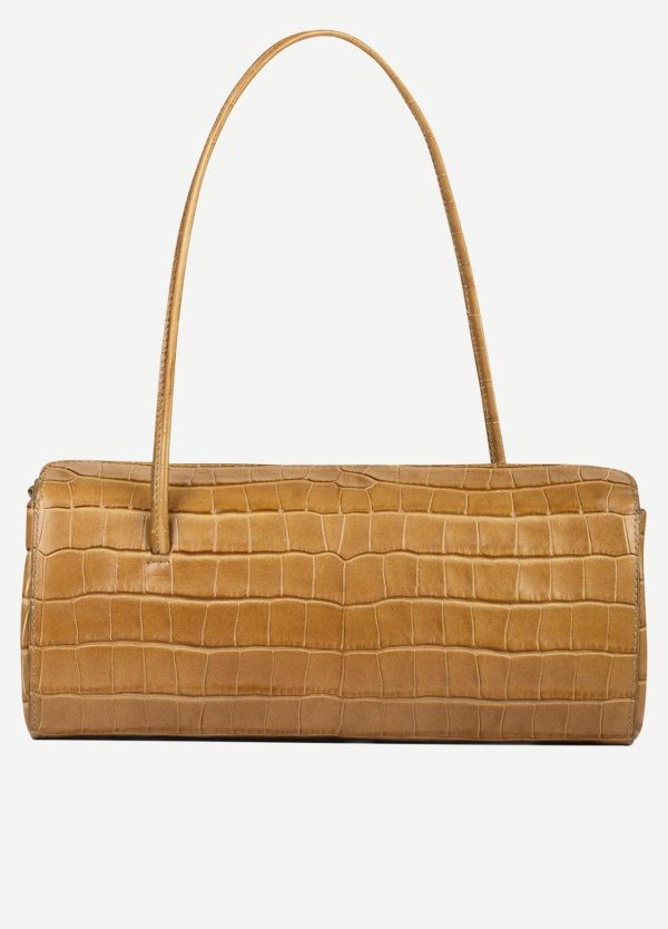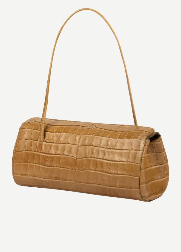 With an eye for playful minimalism, Little Liffner crafts modern handbags with timeless relevance in supple Italian leather. This strict and supple cylinder bag extends from a slim strap, designed to be worn over the shoulder or on the arm. Its croc-embossed leather is offset by a slim glinting chain gilds the lily.