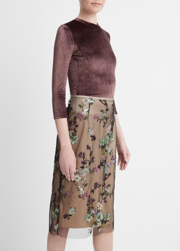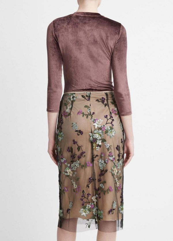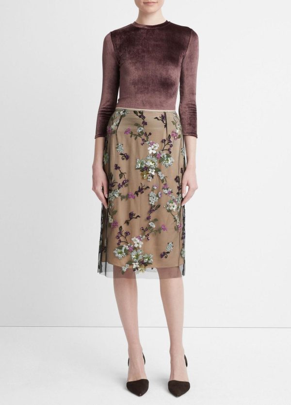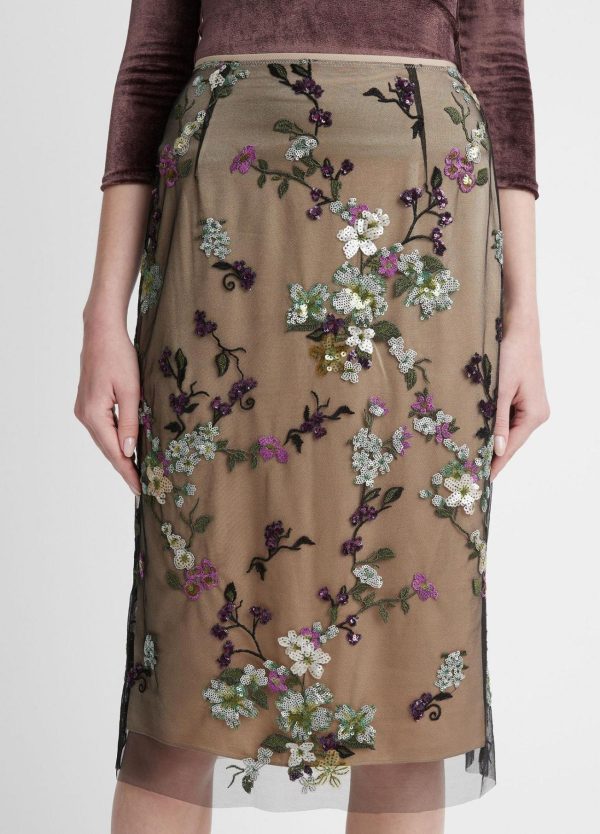 Our knee-length slip skirt is layered with delicate sheer tulle adorned with iridescent sequin begonias.